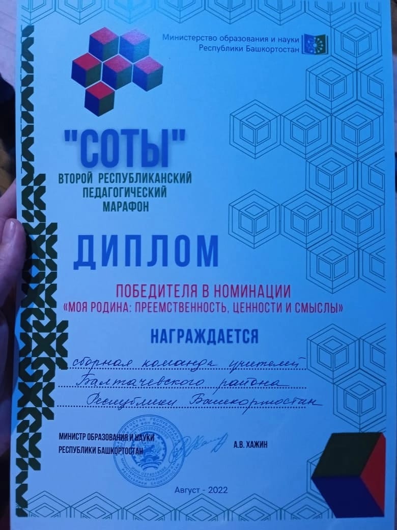 18 августа 2022 года команда учителей нашего района приняла участие во Втором республиканском педагогическом марафоне и стала победителями в номинации "Моя родина: преемственность, ценности и смыслы" среди 13 команд!!!. Коллеги продемонстрировали смелость, креативность, грамотность. Это наши учителя школы #1 Айметова Инга Сергеевна , Гаттарова Айгуль Ильдаровна, Шаймухаметова Алсу Фидаиловна, школы #2 Галимзянов Эльдар Рашитович, Гаскаров Ридаль Ханасович. Особая благодарность за оказанную Гульшат Ришатовне и Гузель Имагинатовне за помощь в подготовке. Желаем дальнейших успехов нашим учителям!
