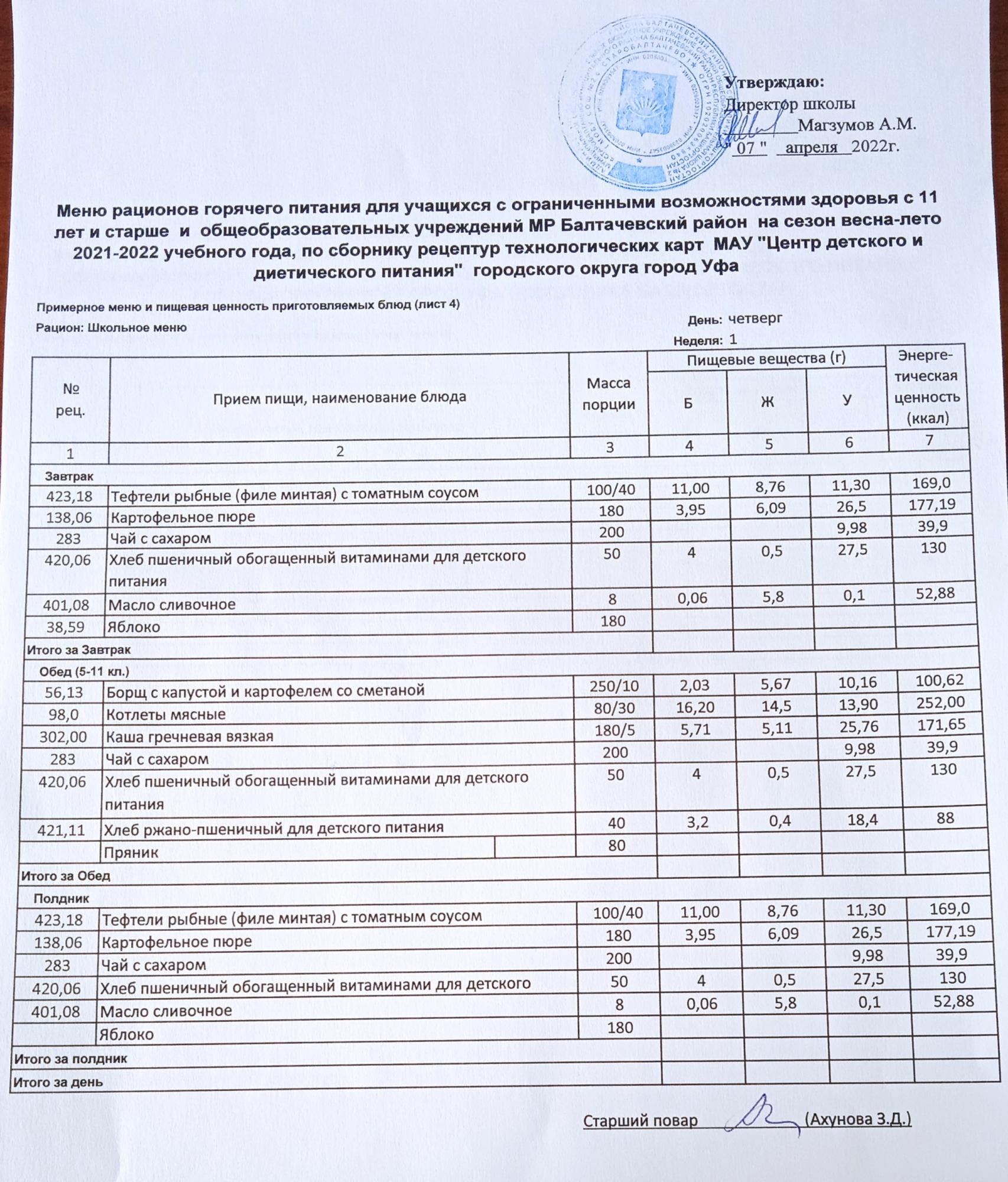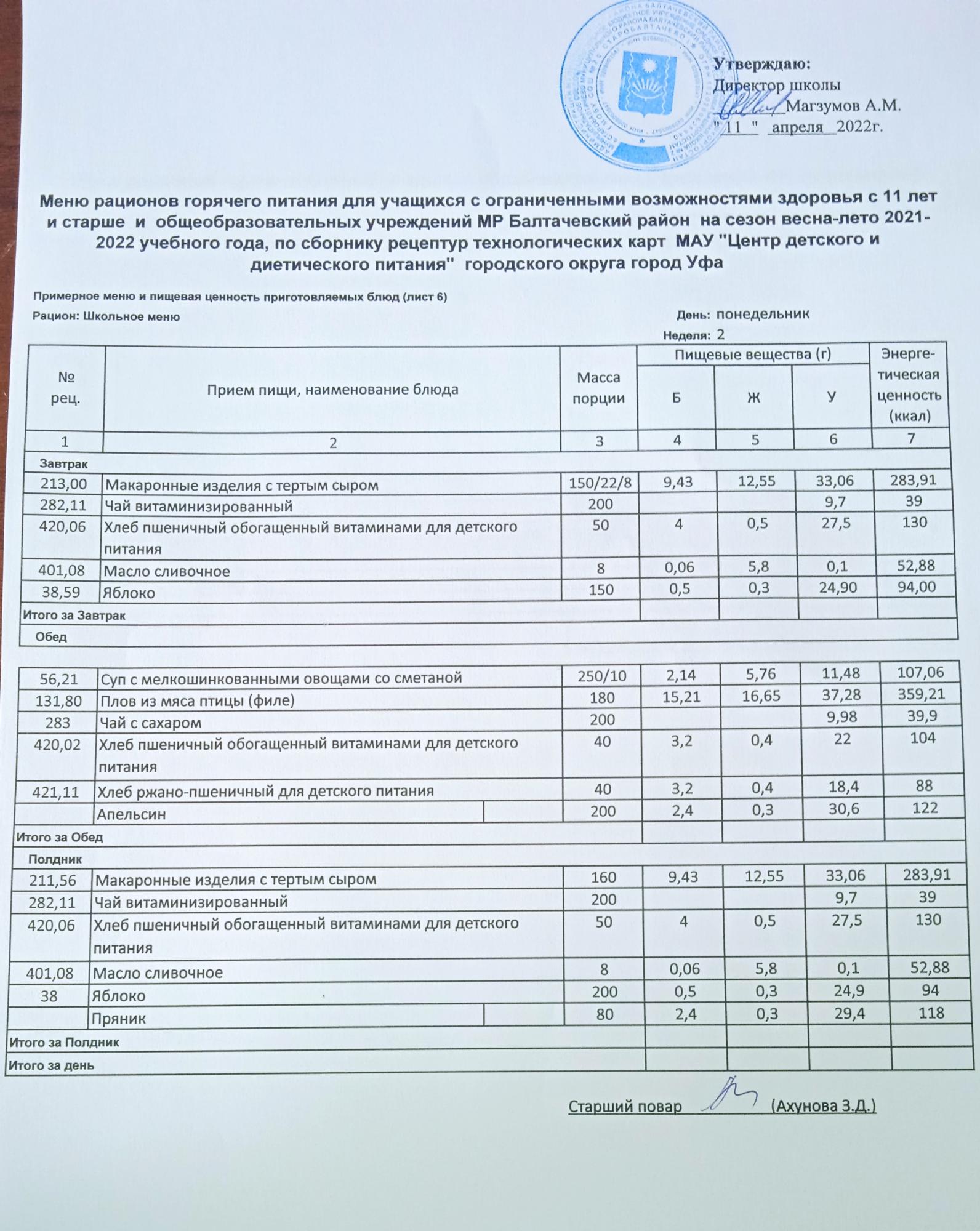 (Фото меню обеда для учащихся с ОВЗ, для учащихся1-4 классов(2 смена))