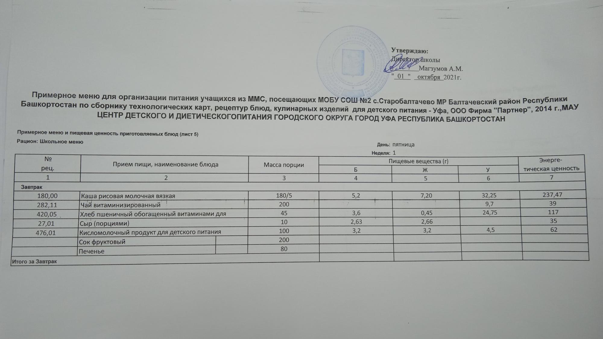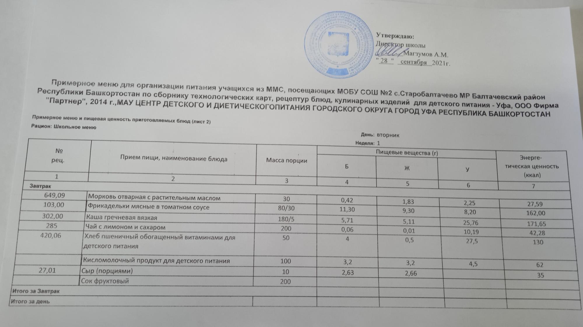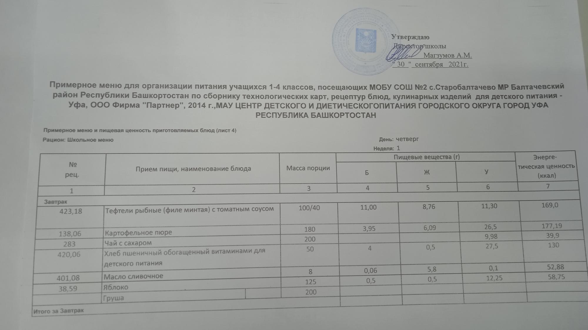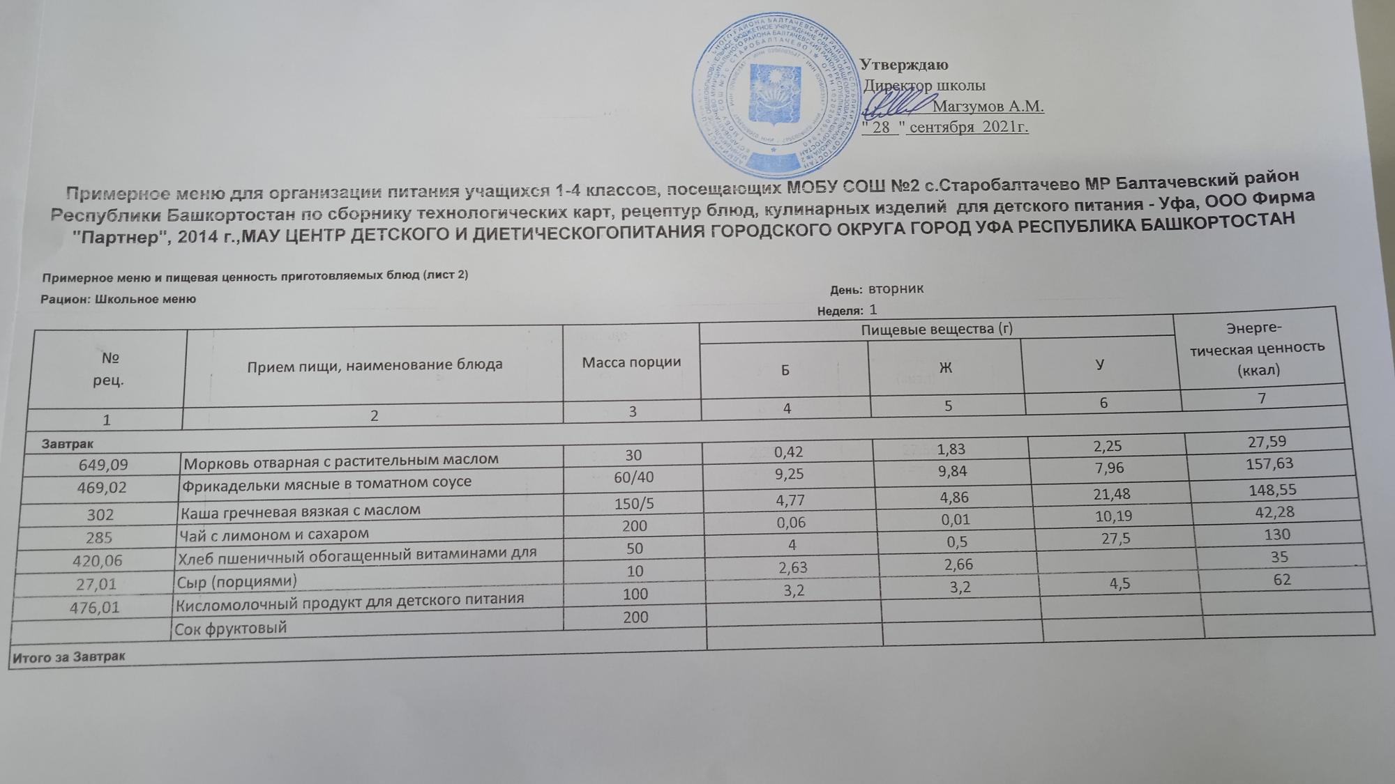 (Фото меню завтрака для учащихся за родительский взнос)