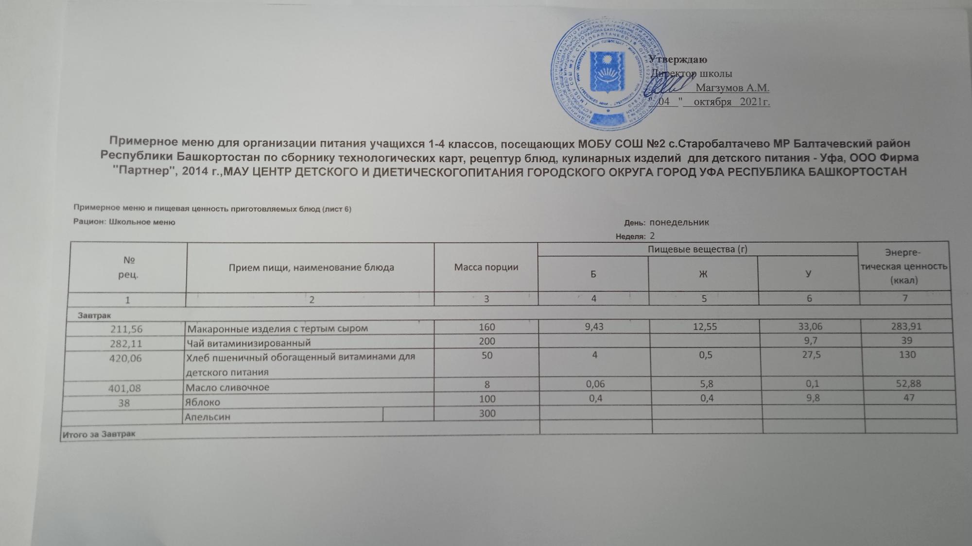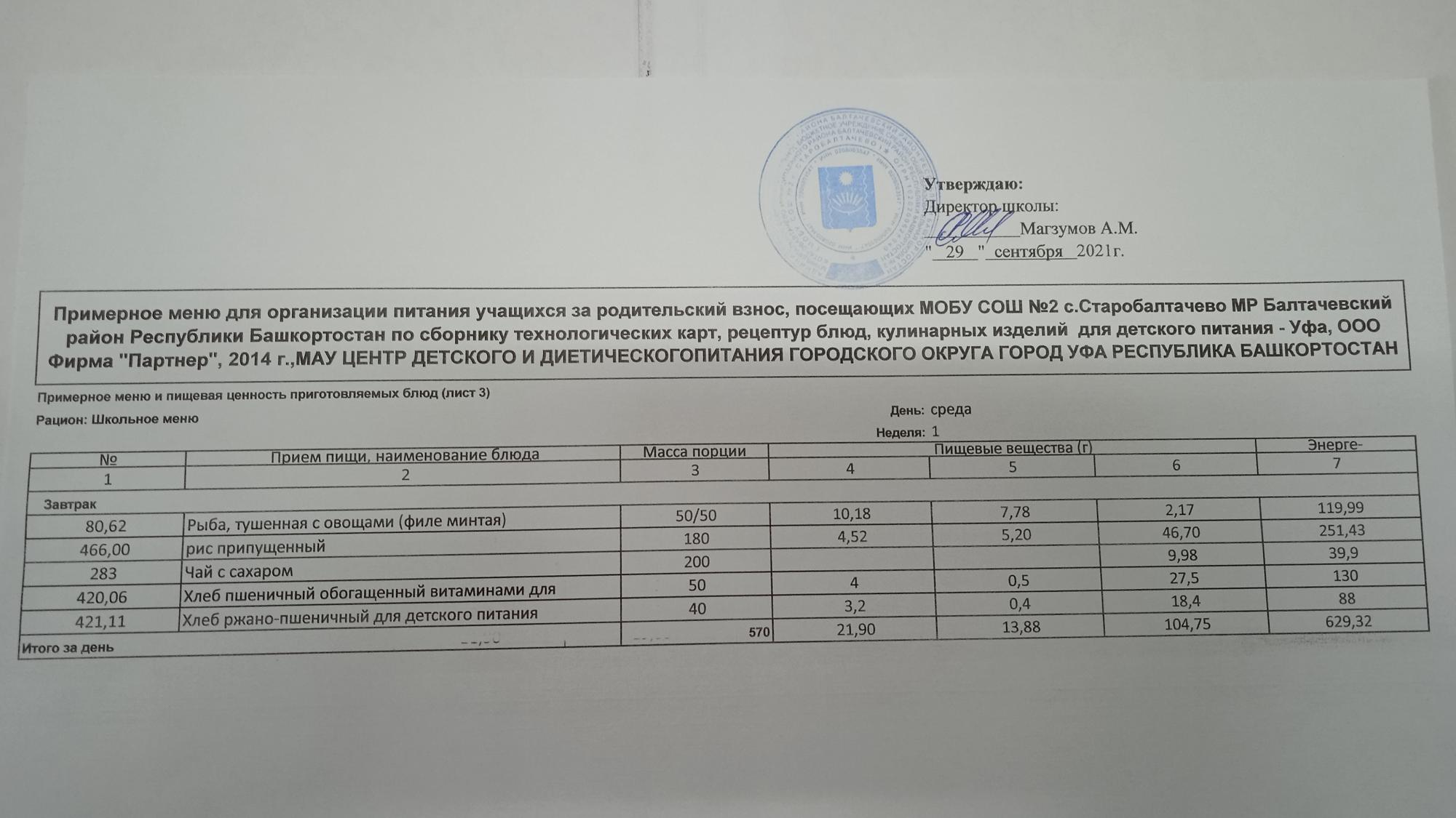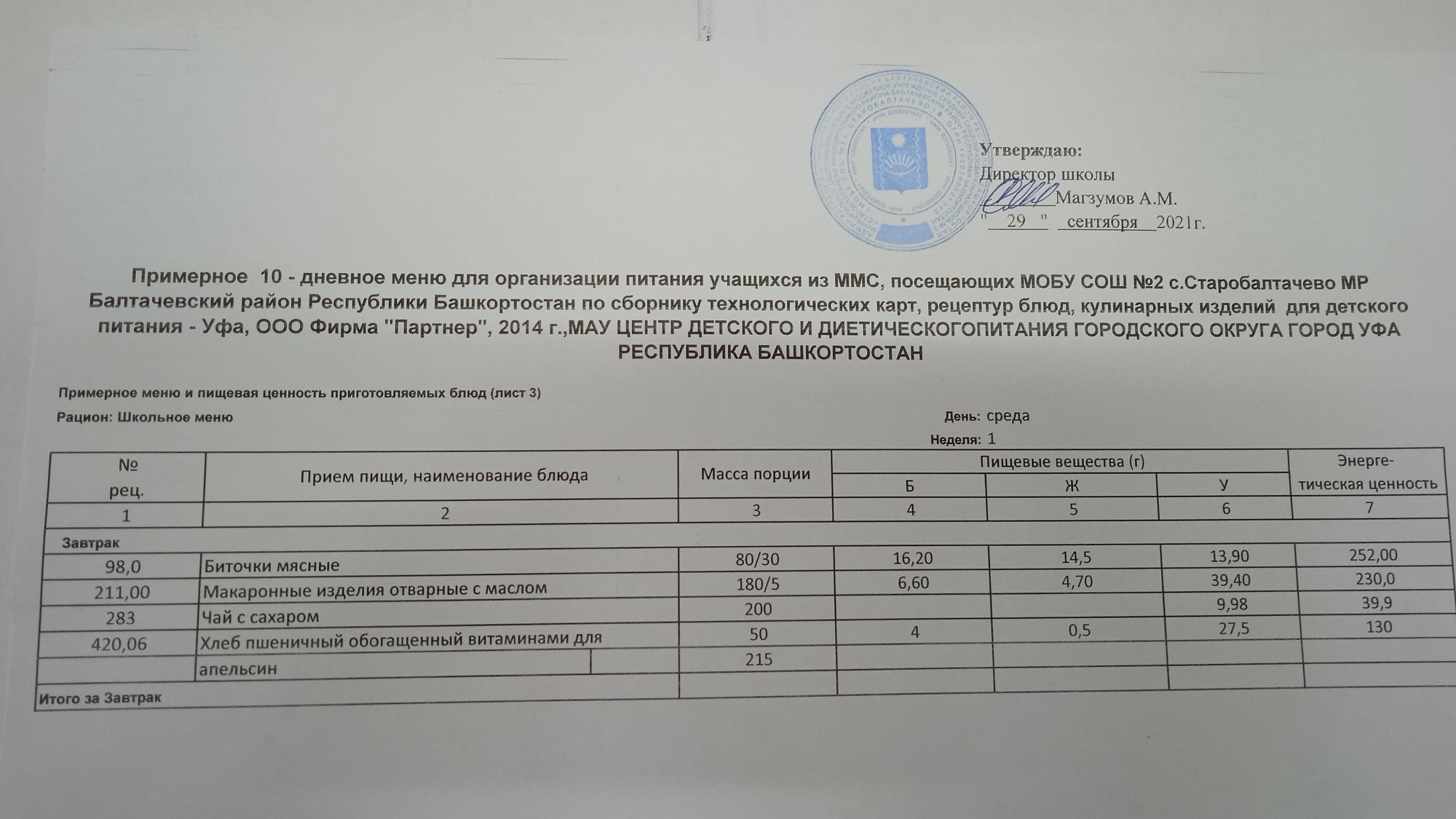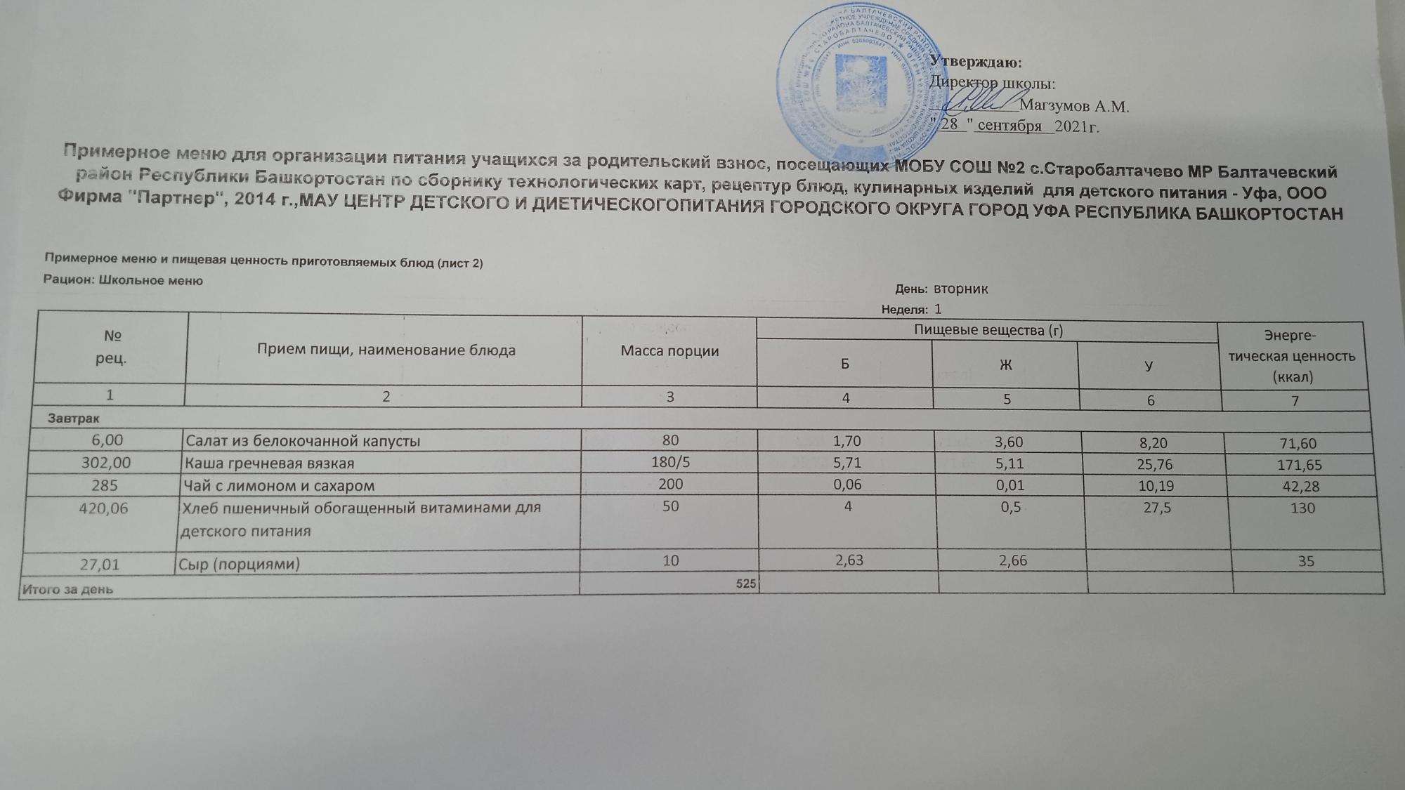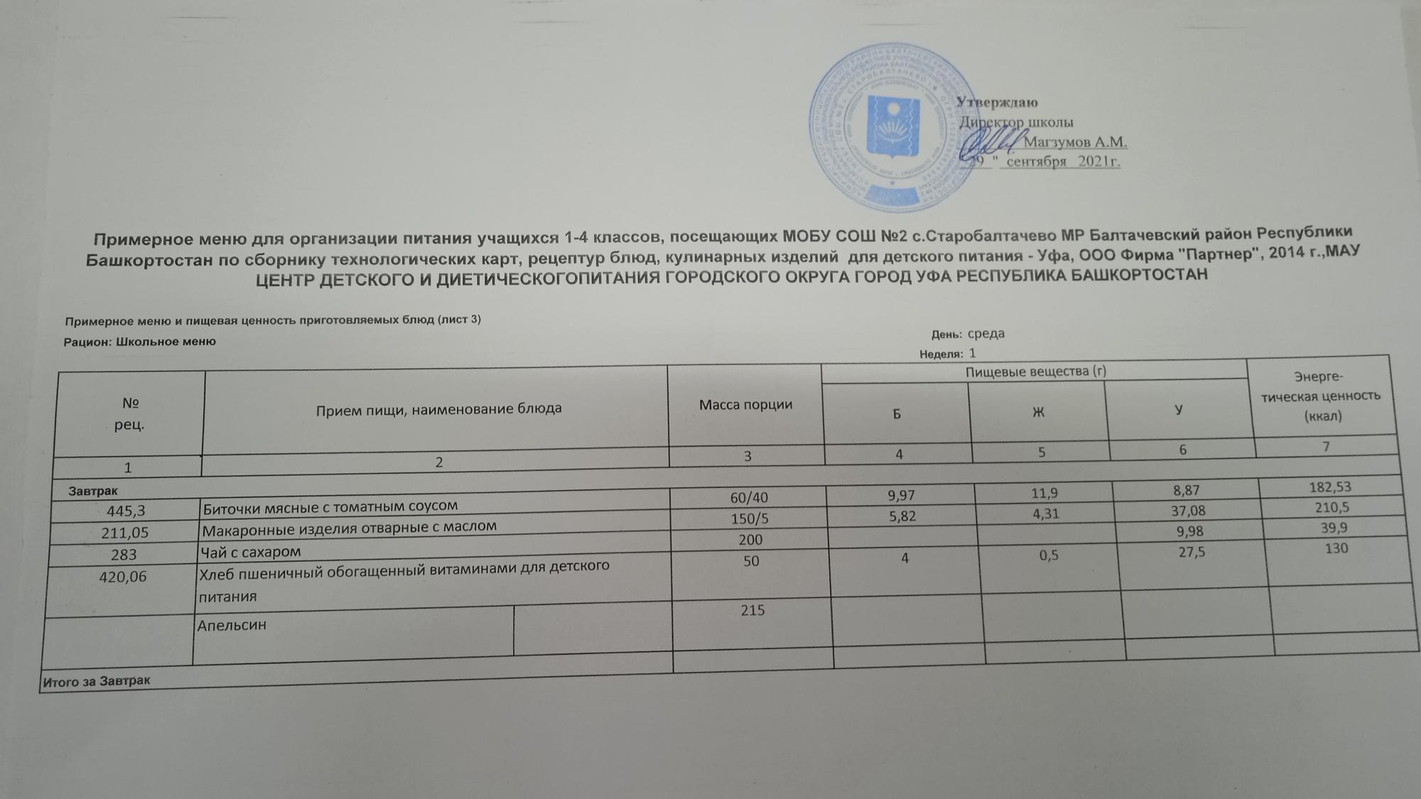 (Фото меню завтрака для учащихся за родительский взнос)