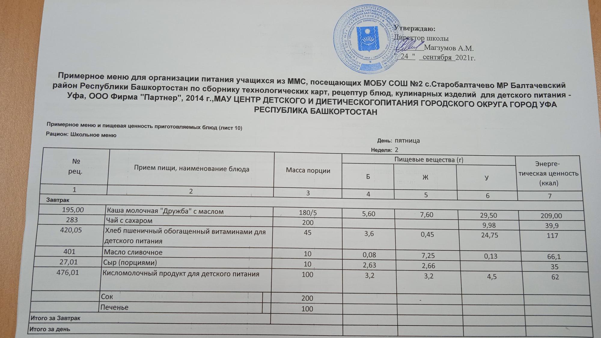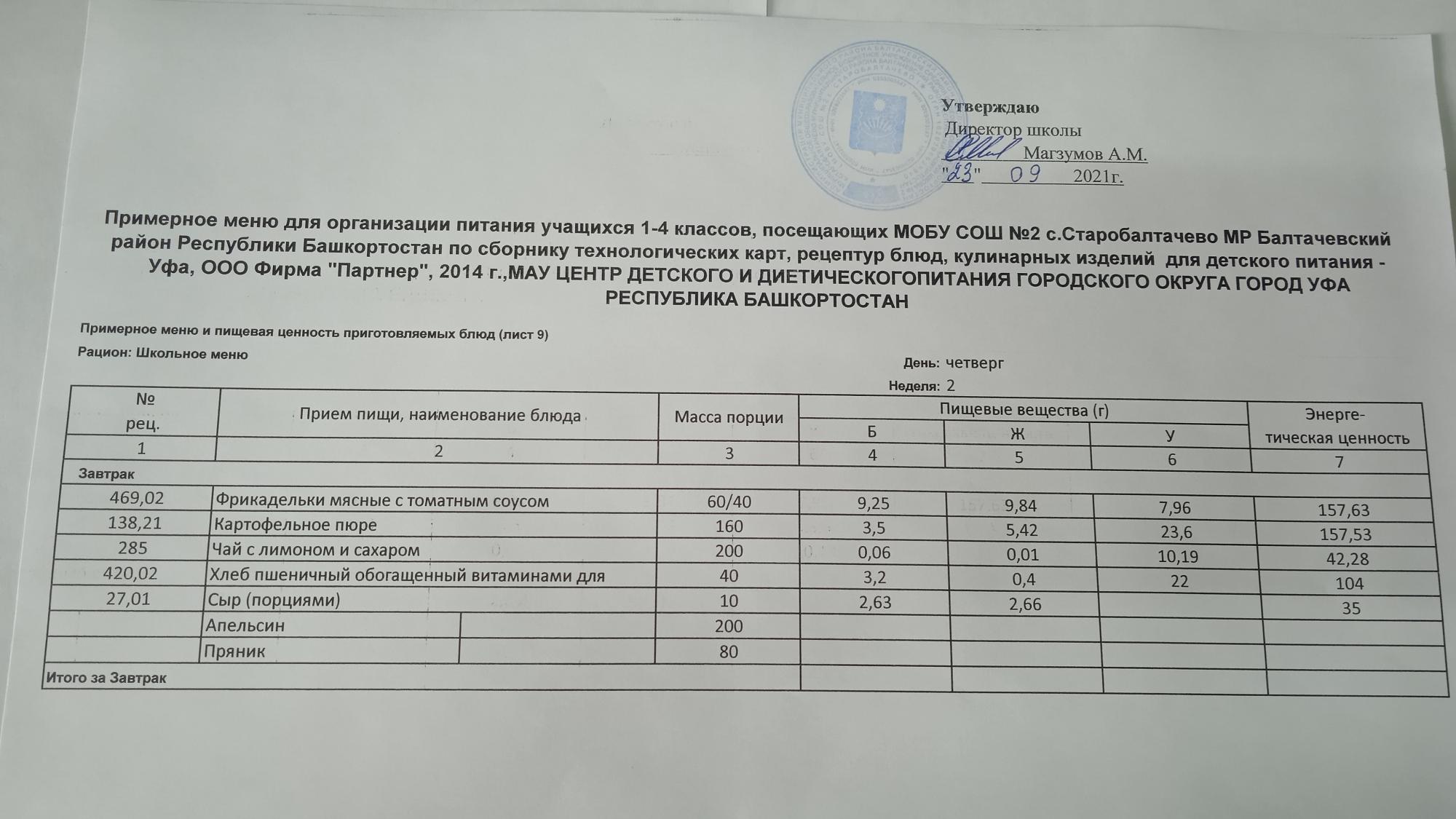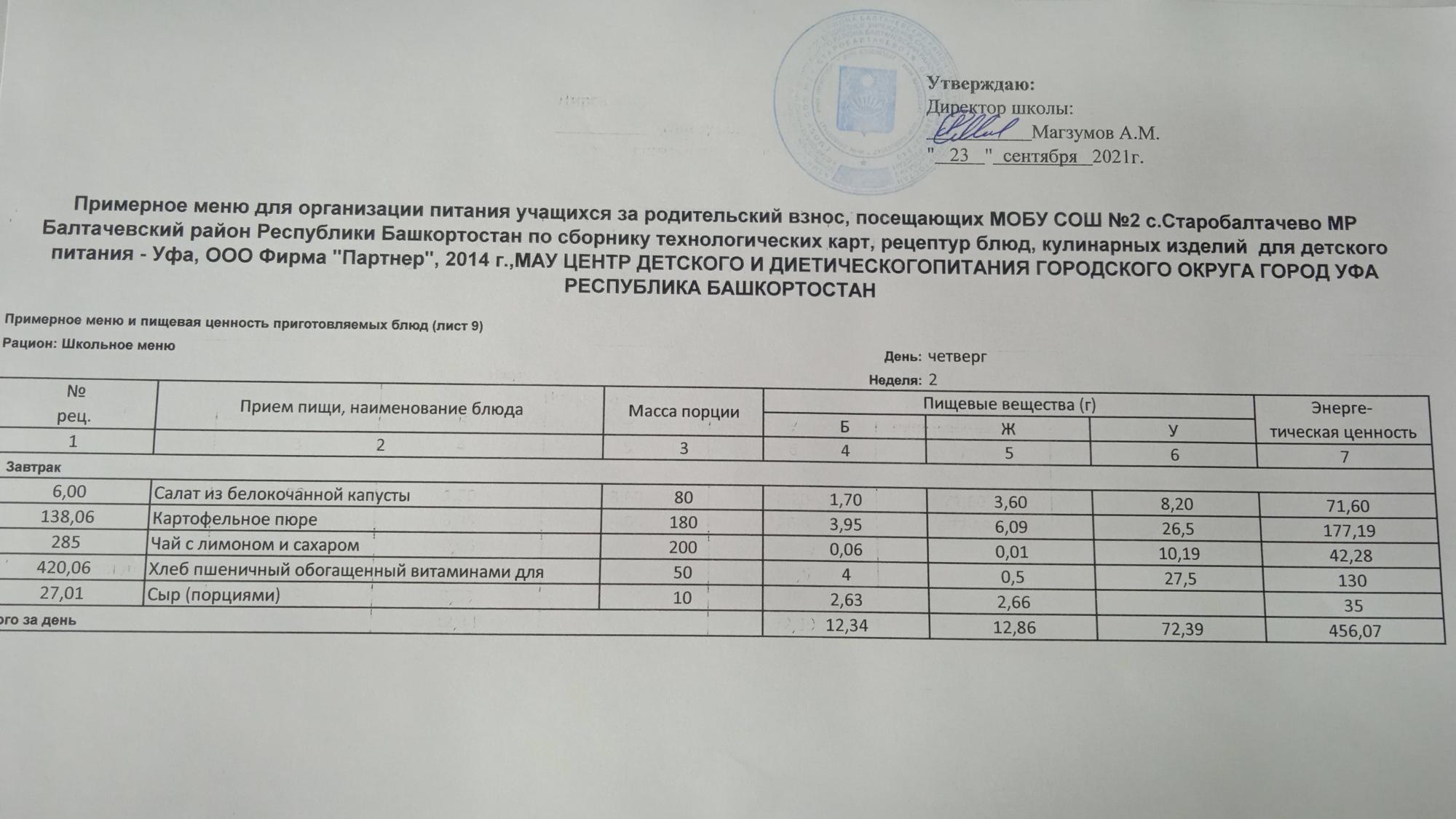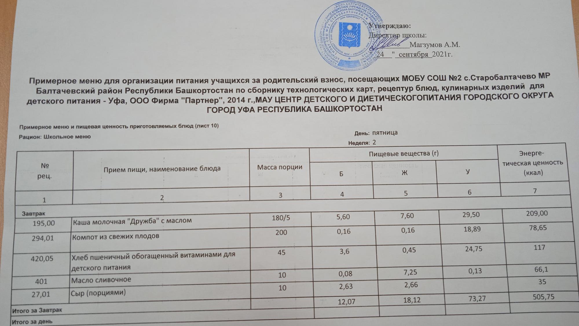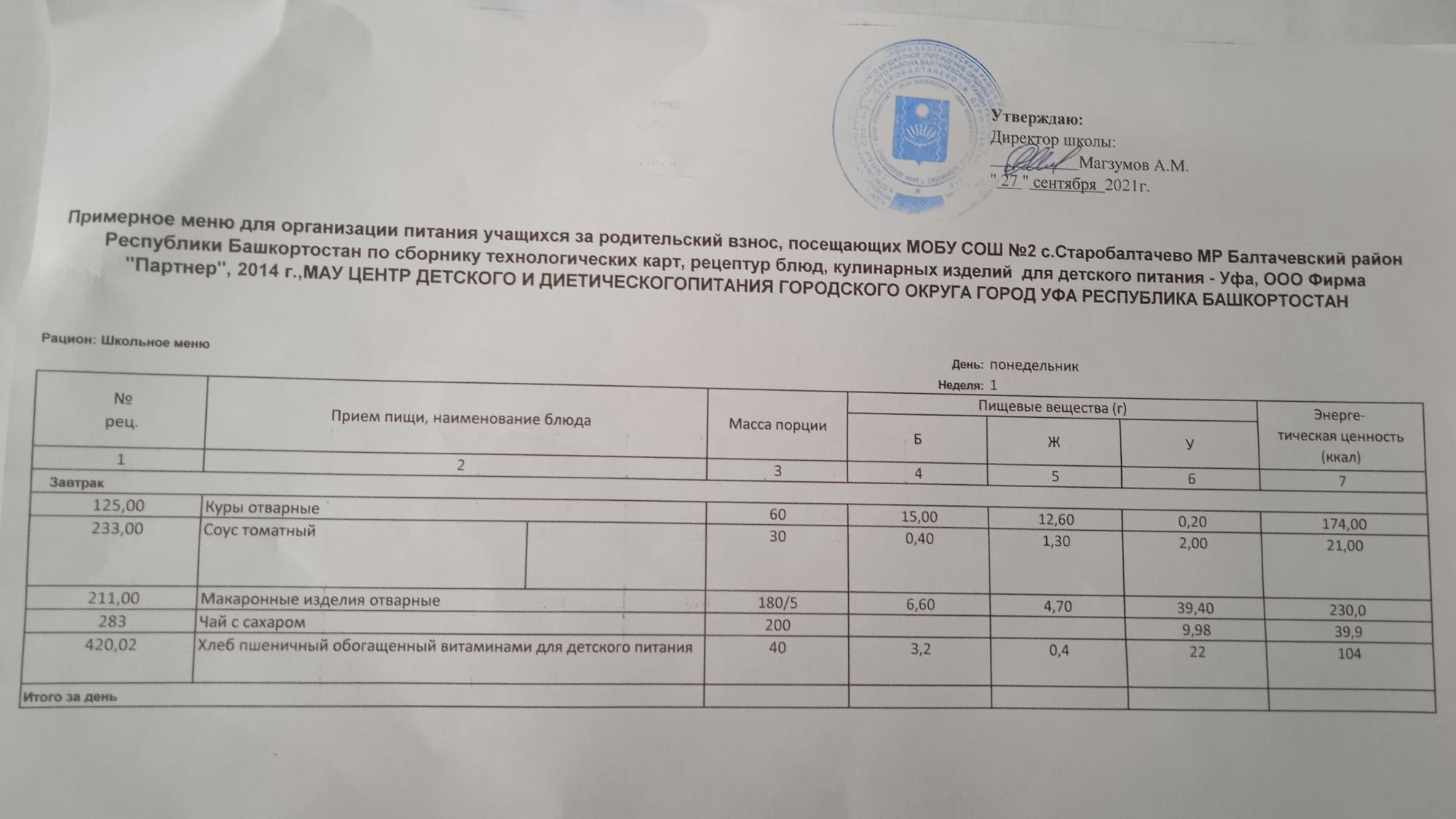(Фото меню завтрака для учащихся за родительский взнос)