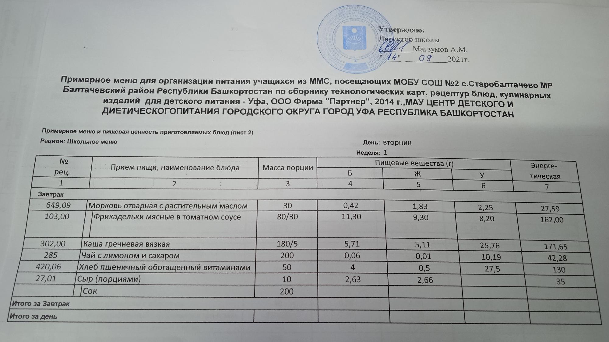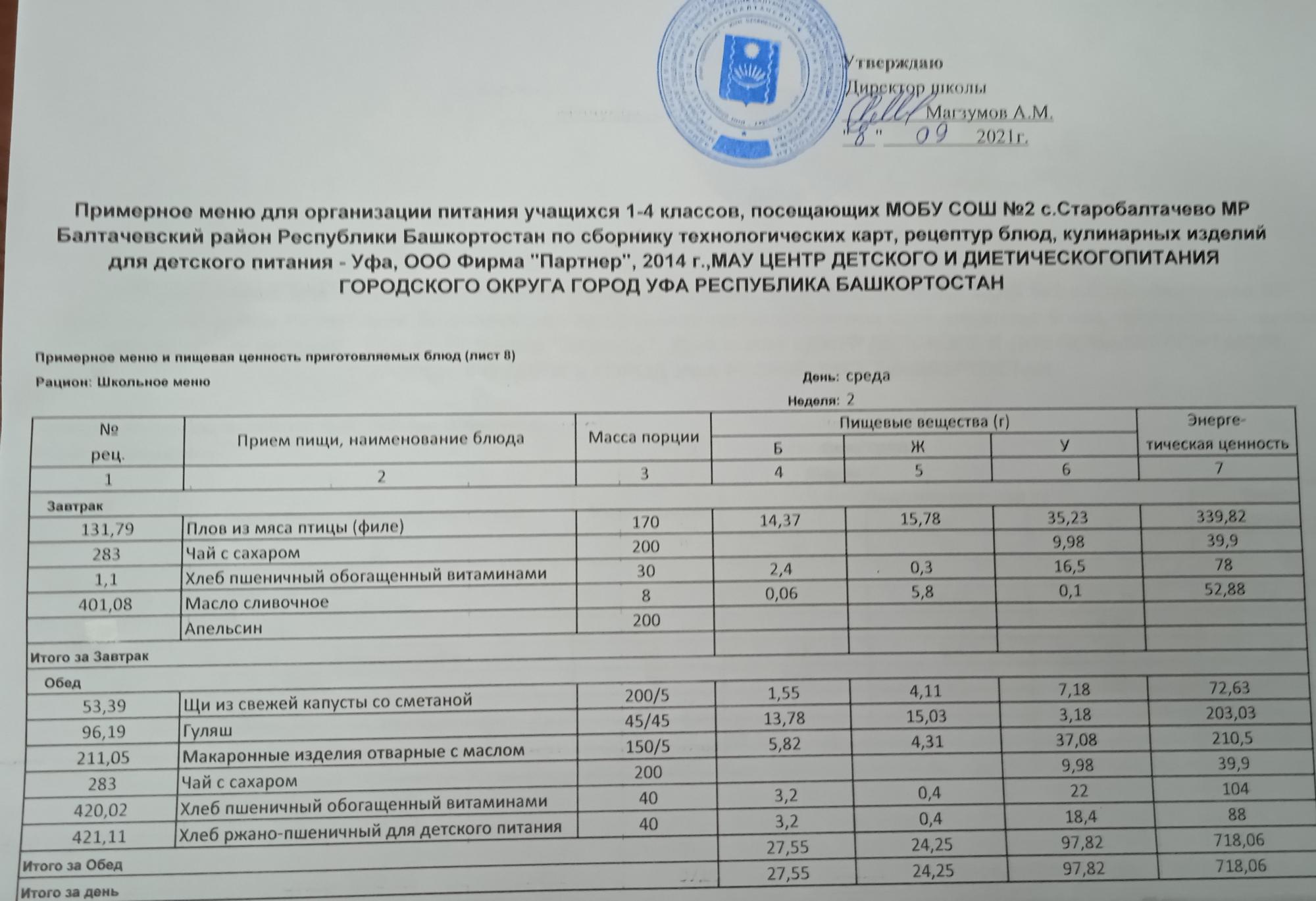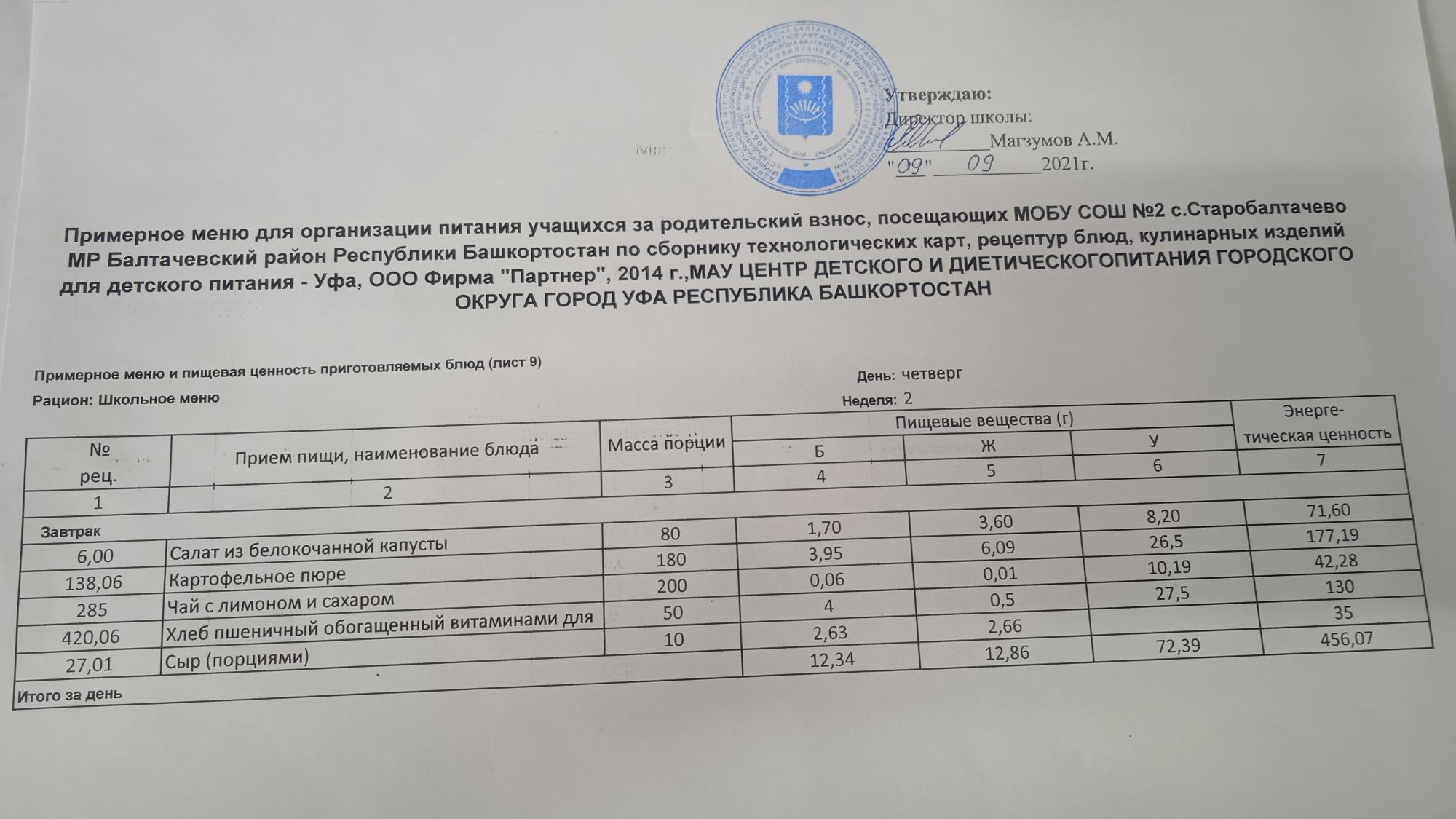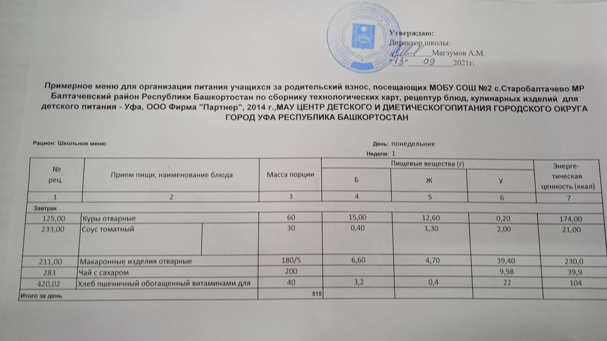(Фото меню завтрака для учащихся за родительский взнос)